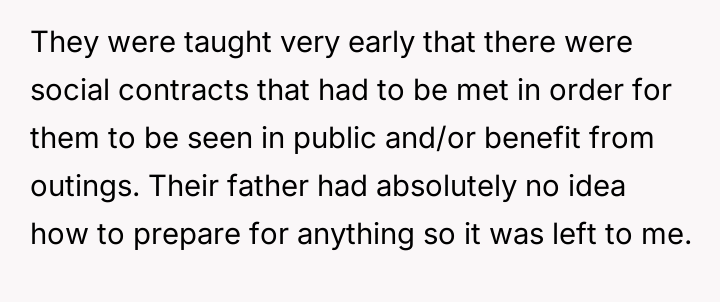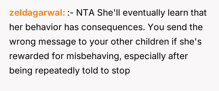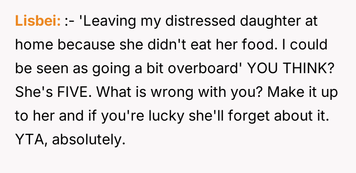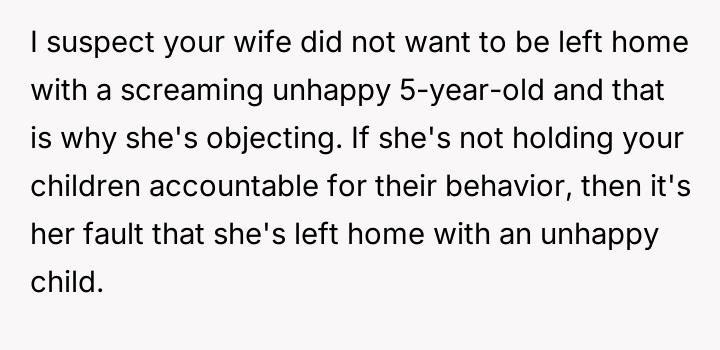 The wife's intervention suggests a difference in perceived alignment between the behavior and the punishment, which can undermine consistent discipline. From a developmental perspective, while consistency is key, discipline for a five-year-old should ideally aim to teach self-regulation. The parent’s action was decisive in upholding the stated boundary, but future application could benefit from incorporating more co-regulation strategies before escalating to total exclusion. A constructive recommendation is to clearly state the required behavior, offer brief, positive reminders, and when consequences are necessary, ensure they are proportional and delivered after a moment of emotional cooling, focusing on teaching the desired replacement behavior rather than solely punishing the failure.