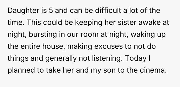 AITA for leaving my 5 year old daughter at home and just taking my son to the cinema?