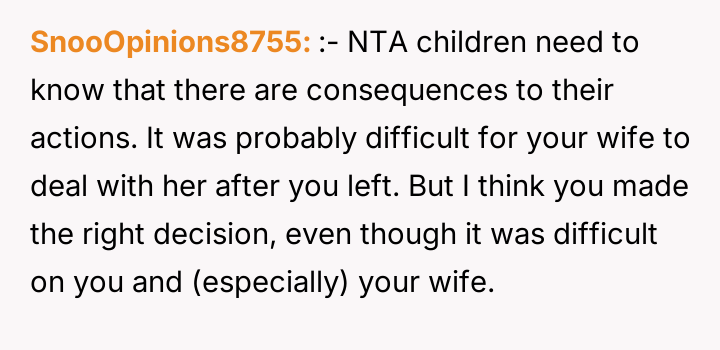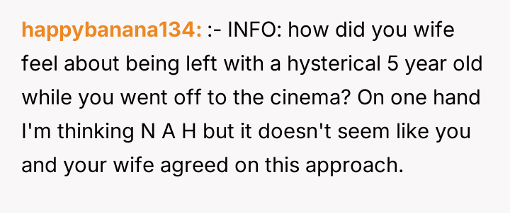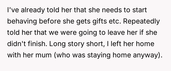 The parent felt the need to enforce a firm consequence for their daughter's persistent difficult behavior by following through on the threat to leave her behind when going to the cinema. This action directly conflicted with the wife's perception that the parent took the discipline too far, highlighting a disagreement over the severity and method of consequence application in response to routine childhood defiance.