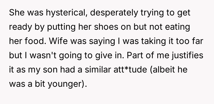 The situation describes a common parenting challenge involving setting and enforcing behavioral boundaries with a young child exhibiting defiance (age 5). The parent employed a high-stakes consequence—withholding a desired activity (cinema trip)—as a direct response to the daughter's failure to meet a simple expectation (finishing breakfast). This tactic, often called 'following through,' is intended to establish clear cause-and-effect relationships for undesirable behavior, as the parent observed success with this method previously with their son. The core conflict here lies in the execution: while setting expectations is crucial for boundary work, the child's reaction—hysteria while attempting to comply only partially (putting on shoes but not eating)—indicates high emotional dysregulation, suggesting the consequence may have triggered fear rather than understanding in that moment.