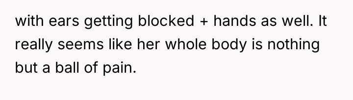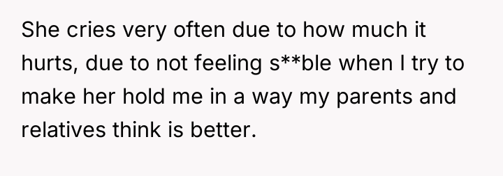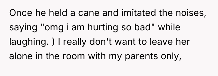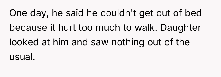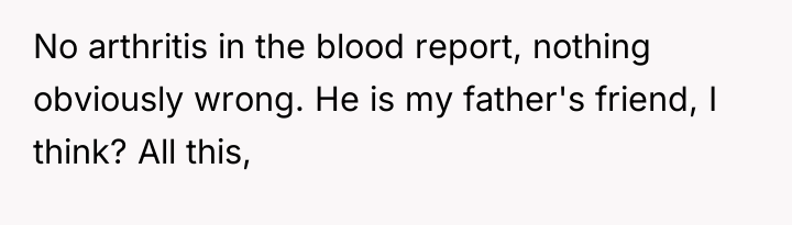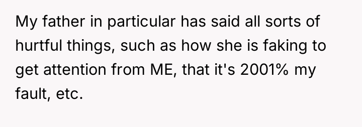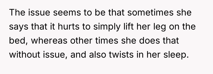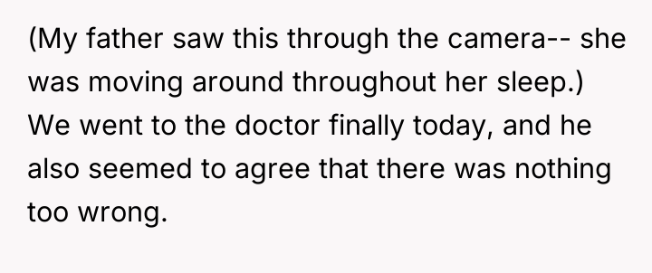 The core conflict is rooted in validating subjective experience versus demanding objective proof. The sister reports pain, which the OP witnesses, yet the medical report offers no definitive diagnosis, leading the family to default to skepticism and punitive measures, exemplified by the father's mocking behavior. This dynamic creates an environment of gaslighting for the sister and intense emotional labor for the OP. When the sister is actively moving in her sleep, it strongly suggests that her physical presentation while awake might be influenced by genuine distress, even if the underlying cause is complex (e.g., conversion disorder, psychosomatic illness, or fluctuating acute pain not captured by blood tests). The OP's attempt to provide physical support, while compassionate, inadvertently reinforces the family's narrative that the sister is incapable.