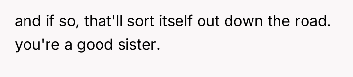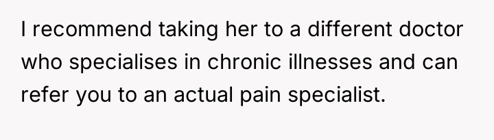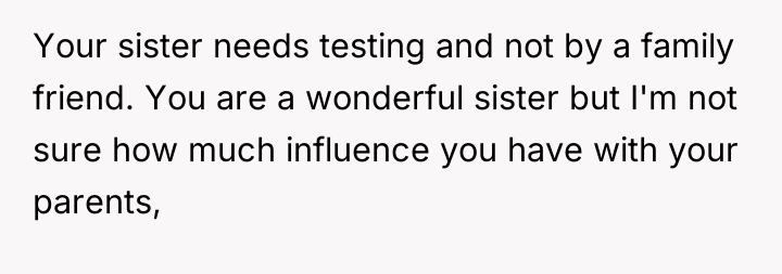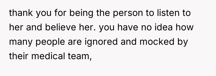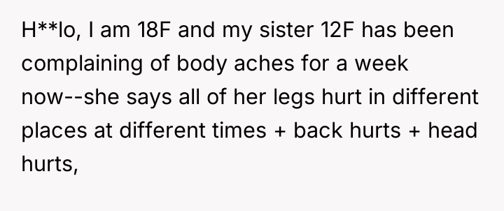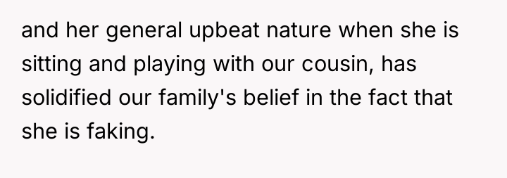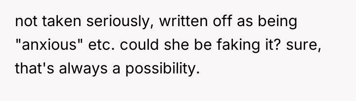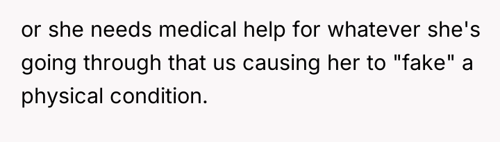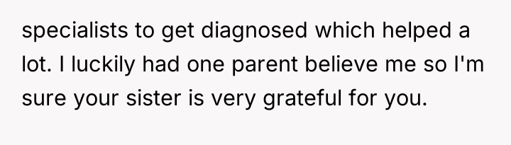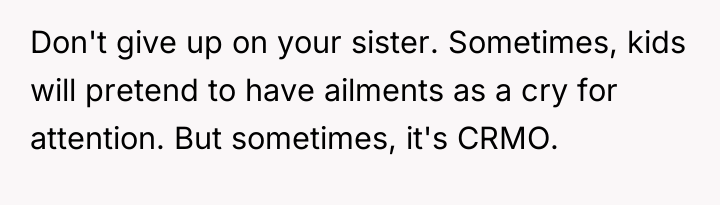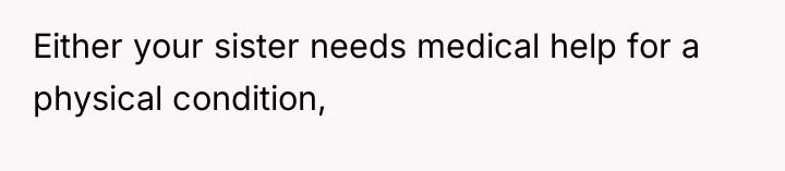 Given the conflicting evidence—a doctor's inconclusive findings versus the sister's clear suffering and the family's punitive reaction—is the OP's primary duty to provide comfort and support based on the sister's subjective experience, or should the OP enforce the family's conclusion that the sister needs to exert more independent effort to overcome potential attention-seeking behavior?