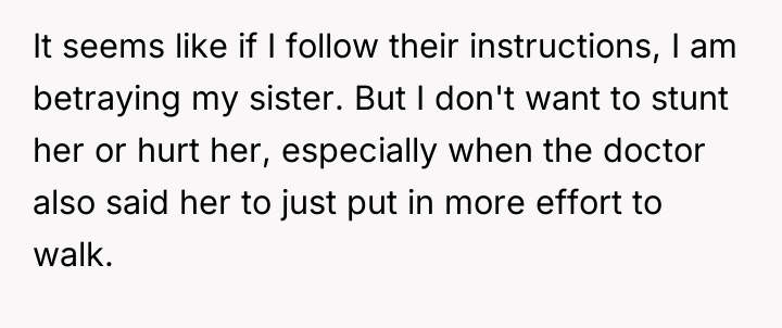 The original poster (OP) is caught between intense loyalty to their younger sister, who reports severe, fluctuating pain, and the persistent belief held by the rest of the family that the sister is exaggerating or faking her symptoms. The OP's desire to support the sister directly conflicts with the family's expectation that the OP should enforce more independence, leading to significant emotional distress and a feeling of betrayal when trying to comply with parental directives.