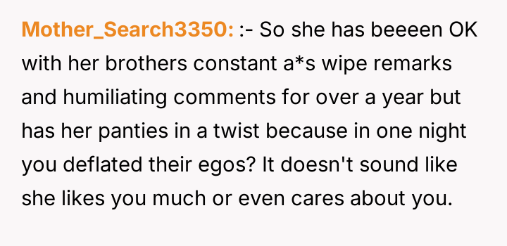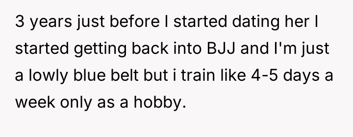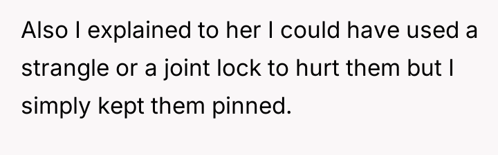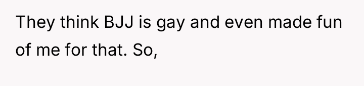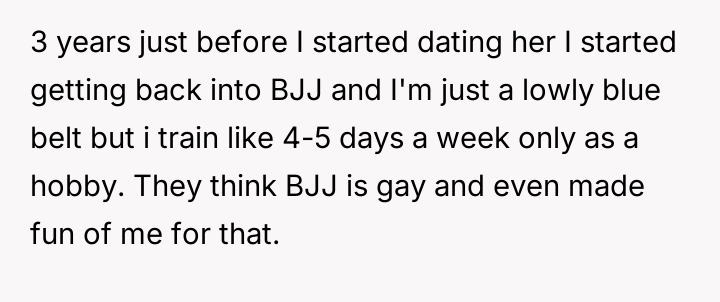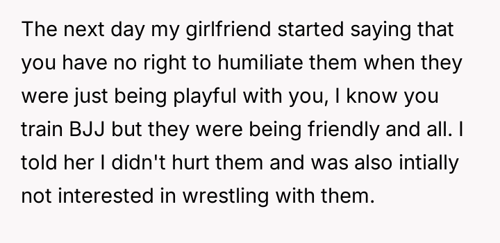 The OP’s motivation appears to be a defense of self-respect against targeted, ongoing harassment disguised as 'playful' teasing. His decision to utilize his BJJ skills while deliberately avoiding injury (pinning instead of submitting) demonstrates a calculated attempt to neutralize the threat without causing lasting harm, yet the silence and souring mood indicate that the demonstration itself profoundly violated the brothers' expectations of male hierarchy. The girlfriend's reaction suggests a conflict between loyalty to her family's established dynamic and support for her partner; labeling the OP as insecure minimizes his experience of being bullied.