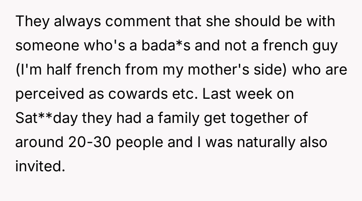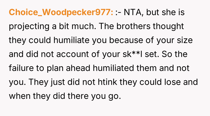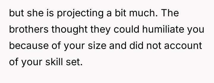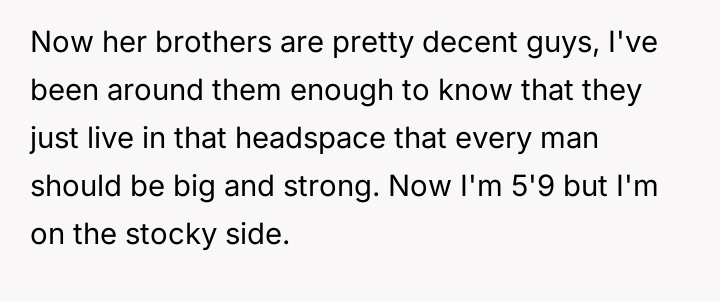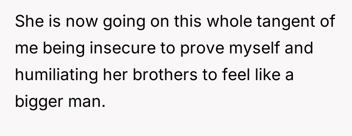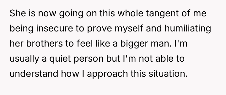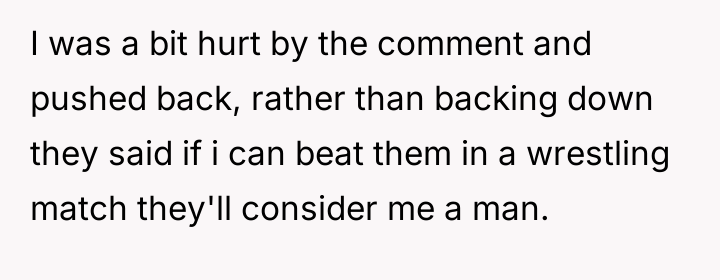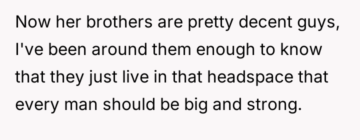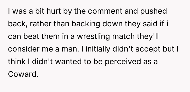 As renowned social psychologist Dr. Philip Zimbardo explains, “The power of the situation to shape behavior is immense; it can lead ordinary people to do extraordinary things.” In this scenario, the OP was placed in a highly pressurized 'situation' created by the brothers' repeated public challenges rooted in traditional masculine ideals (height, strength, perceived cultural weakness). The brothers explicitly framed acceptance into the family as conditional upon winning a physical contest, thus creating a social trap.