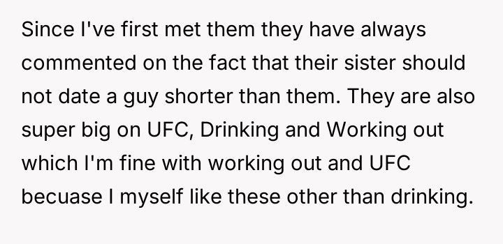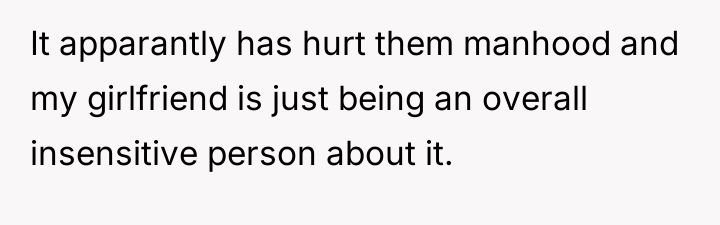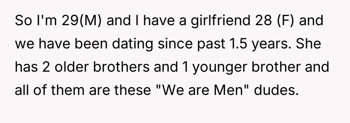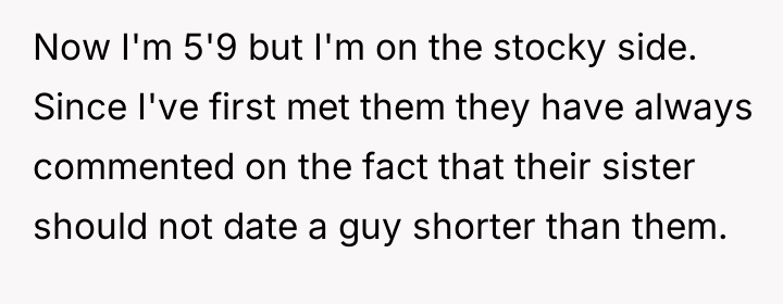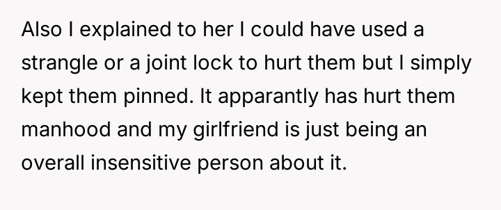 The original poster (OP) felt compelled to defend his masculinity against persistent, derogatory comments from his girlfriend's brothers regarding his height and perceived cultural background, leading him to engage in a wrestling match he ultimately won decisively. His girlfriend, however, sided with her brothers, accusing him of humiliation rather than acknowledging the context of their provocation and his restraint during the physical confrontation.