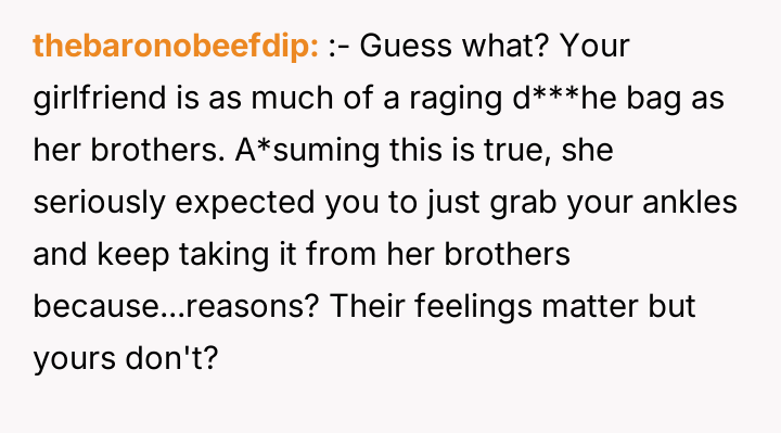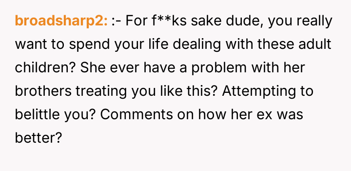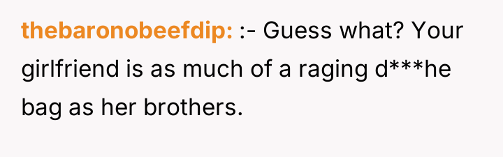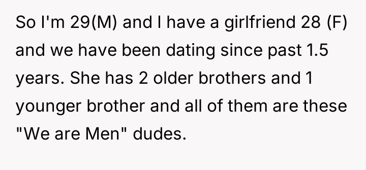 The OP’s actions were an understandable, though high-risk, response to severe social pressure and continuous disrespect. A more constructive approach in the future would involve direct, non-physical boundary setting communicated clearly to the girlfriend beforehand, asking her to intervene directly against her brothers' comments. If the brothers persist, setting a clear boundary, such as refusing to attend events where they intend to degrade him, is a stronger long-term strategy than winning a physical contest.