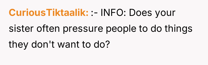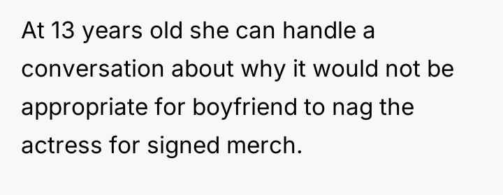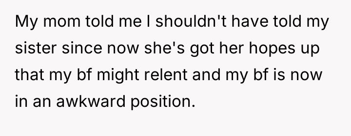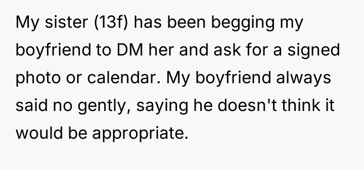 The OP's action of sharing the sister's request introduced external pressure into this established boundary. While the OP may have intended to support the sister's enthusiasm, it unintentionally forced the boyfriend into a position where he had to reiterate his refusal, potentially feeling scrutinized or tested. The mother correctly identified that this action put the boyfriend in an awkward spot, as it escalated a private boundary issue into a family negotiation. The boyfriend's consistent, gentle refusal demonstrates good emotional regulation and respect for the difference between past acquaintance and current appropriateness.