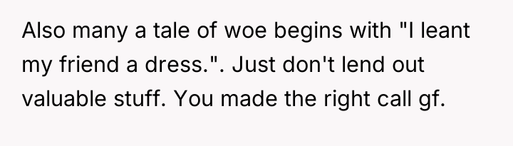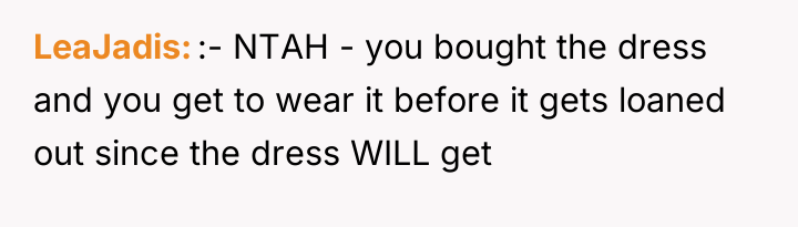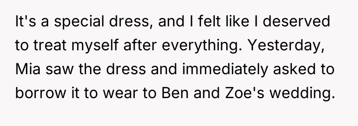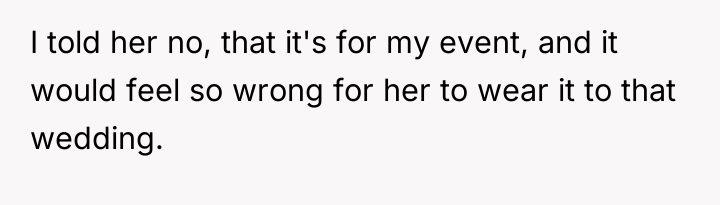 The OP’s refusal was entirely appropriate. The dress is a personal item tied to an event the OP is attending, and borrowing it for an event celebrating the people who caused the OP pain creates an untenable emotional situation. A constructive approach for future conflicts would be for the OP to clearly state the boundary and the reason (e.g., “That dress is reserved for my charity event, and I need it for my own healing process right now”), rather than getting drawn into arguments about who is being selfish. The priority must remain protecting her own emotional space.