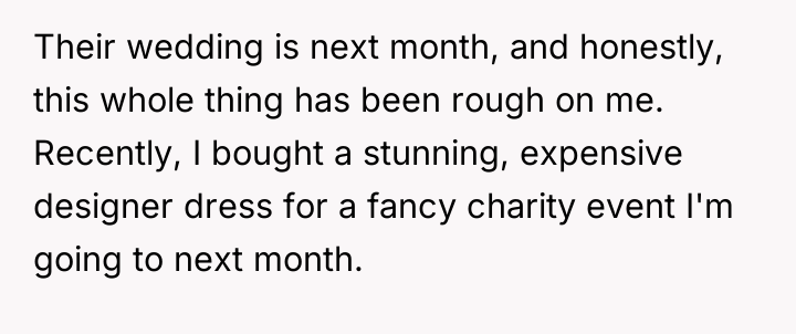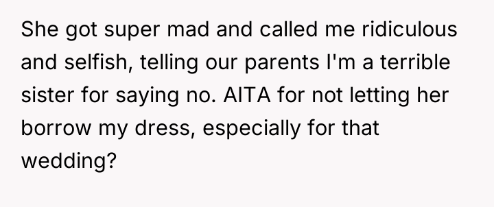 The situation described involves significant emotional triggers for the Original Poster (OP). The dress is not just clothing; it represents a personal treat and a tool for self-care following a painful public breakup with her fiancé, who is now marrying a former friend. When the sister, Mia, demands the dress specifically for the wedding, she is actively seeking to minimize the OP's emotional recovery process and is introducing an element of relational conflict into the OP's boundary-setting attempt. Mia’s accusation of selfishness is a common reaction when boundaries are enforced, often serving as an attempt to guilt the OP into compliance by shifting the focus from the appropriateness of the request to the OP's character.
