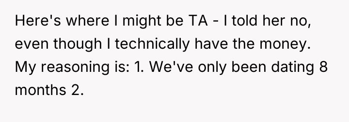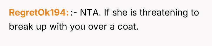 The OP's motivation appears rooted in fiscal responsibility and a desire to focus on shared future security, which are healthy long-term relationship indicators. Conversely, the girlfriend's fixation on the Skims jacket, particularly framing it as the sole metric for the OP's level of care, suggests emotional transference onto material goods. For an eight-month relationship, such a high-stakes demand, backed by an ultimatum, signals poor emotional regulation and potentially codependent expectations regarding financial investment as a substitute for genuine emotional connection.
