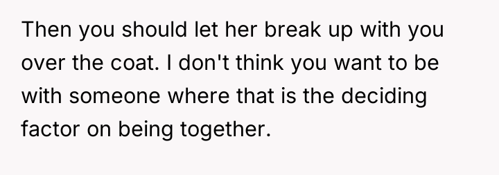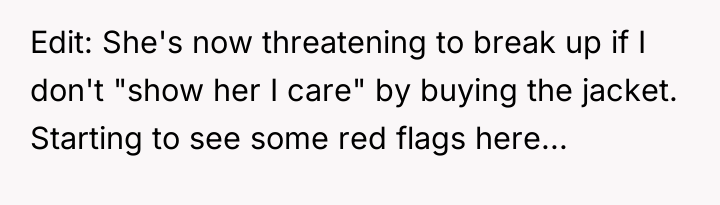 Given the girlfriend's ultimatum—demanding the jacket as proof of care or threatening to end the eight-month relationship—the core question becomes: Should a partner prioritize an expensive, non-essential material purchase requested by the other, or is it reasonable to set financial boundaries and prioritize savings or shared investments, even when temporary funds are available?