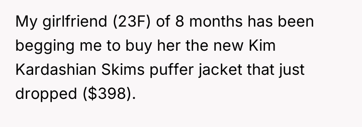 AITAH for not buying my girlfriend the new Kim Kardashian puffer?