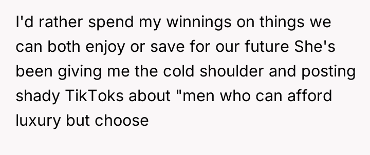 The original poster (OP) is facing significant conflict because his girlfriend demands a specific, expensive luxury item ($398 jacket) despite the OP having already demonstrated generosity with a portion of his winnings on shared experiences. The central issue is a clash between the girlfriend's expectation of immediate material gratification, framed as a measure of affection, and the OP's preference for financial prudence and investing in shared, long-term enjoyment.