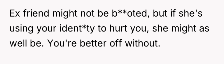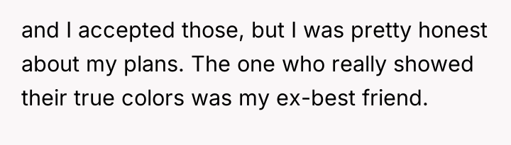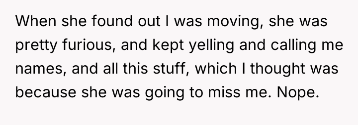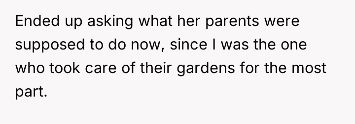 The former best friend's reaction reveals a dynamic where her sense of entitlement or obligation superseded genuine care for the OP’s departure. Her focus on the garden maintenance and the thinly veiled digs suggest she weaponized dependency (her parents needing help) and personal insecurity (the comments about skirts) to exert control and inflict pain. This is a common pattern in dysfunctional relationships where the dependent party reacts with aggression when their expected support structure is removed.