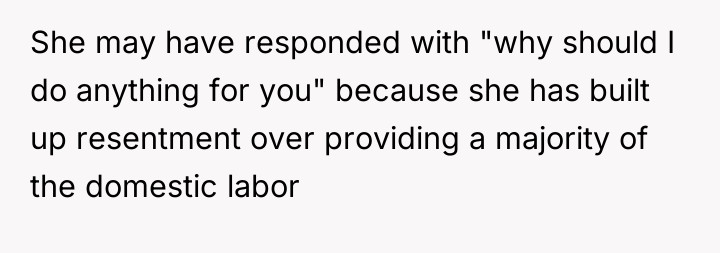 The situation described highlights a critical juncture in the relationship where perceived value and emotional contract have been severely tested. For five years, the OP carried the primary financial burden, while the wife handled a significant portion of the domestic labor. This arrangement established an implicit reciprocity, even if unspoken. Upon securing employment, the wife’s question, “Why should I do anything for you?” signals a sharp re-negotiation of this contract, suggesting she now views the marriage only through the lens of independent contribution, discarding the shared history and emotional labor previously exchanged.