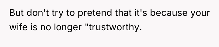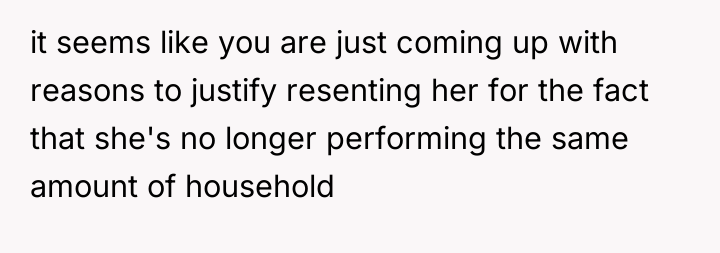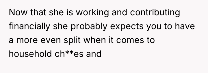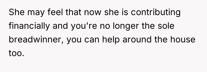 The original poster is experiencing significant distress and a profound loss of trust, stemming from his wife’s sudden withdrawal of domestic support and her seemingly dismissive attitude regarding his feelings. The core conflict lies between the husband’s expectation of shared responsibility and reciprocity in the marriage, versus the wife’s apparent assertion of autonomy, possibly viewing her contribution solely through a financial lens now that she is employed.