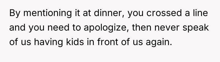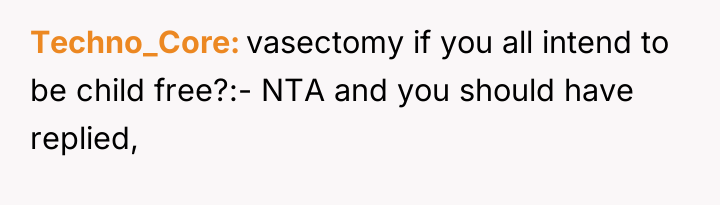 The OP's actions were appropriate given the severity of the perceived threat to her bodily autonomy. For future interactions, the constructive recommendation is for the OP and her husband to engage in a non-defensive discussion about what constitutes an absolute boundary in their marriage. If the husband continues to minimize threats to their childfree status, this indicates a deeper, unresolved issue regarding their shared life goals that requires professional couples counseling to establish a united front against external pressure.