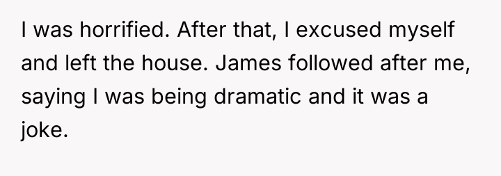The husband's reaction—dismissing the OP's horror and labeling her as "dramatic"—indicates a failure to validate his partner's legitimate fear and a prioritization of keeping the peace with his mother over confronting unacceptable behavior. This pattern suggests poor marital alignment on boundary enforcement. The OP's immediate action to leave was an appropriate, albeit escalated, response to an intolerable level of psychological and implied physical violation.