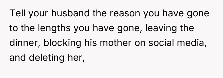 Was the OP's immediate, defensive action of leaving the event and blocking her MIL justified given the extreme nature of the threat, or did her husband have a valid point that she overreacted to what was presented as a cruel joke, thus failing to prioritize marital unity in that moment?