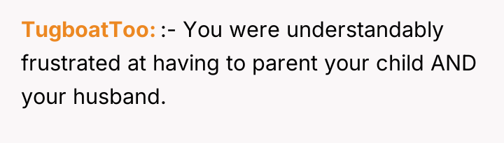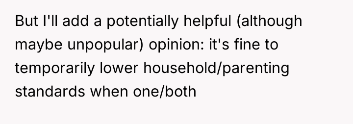The OP’s reaction, while stemming from valid resentment over inequity, was not constructive, as she 'lost it' and needed to be reminded by her husband that she was being mean. The appropriate action would have been to pause the cleaning, communicate her feeling of being overwhelmed, and negotiate a specific, manageable task for him (e.g., 'I need you to handle bedtime routine for 30 minutes while I clean up, even if it's slow'). Moving forward, the couple needs a pre-agreed protocol for when either partner is sick, defining which tasks are essential and how childcare will be divided when one person is temporarily impaired.