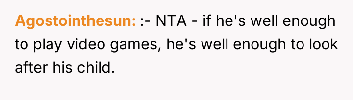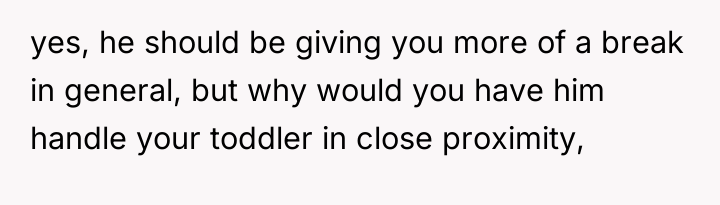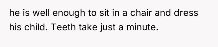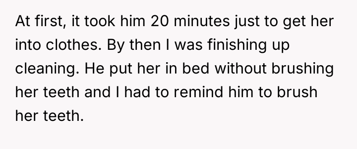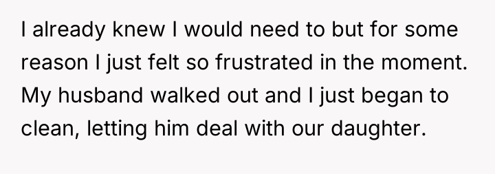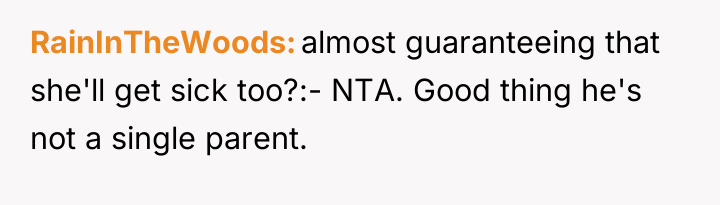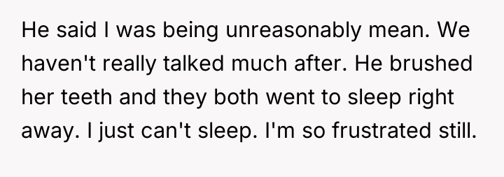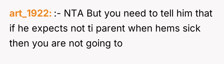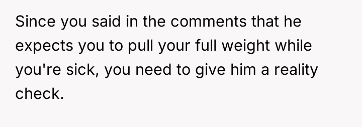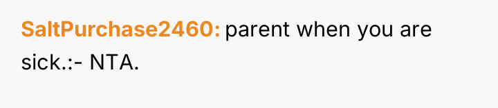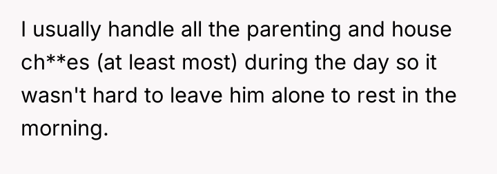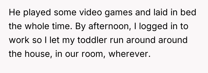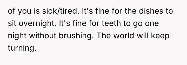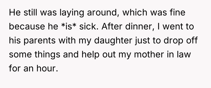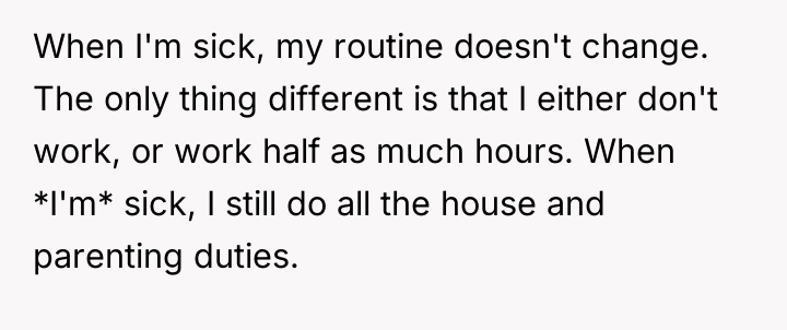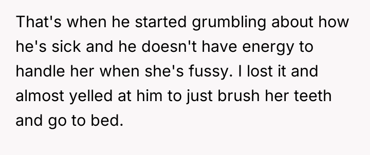The OP's frustration stems from a perceived double standard regarding illness recovery. When the OP is sick, she maintains the routine, suggesting her belief is that adult partnership requires maintaining baseline responsibilities regardless of temporary health status. Conversely, the husband's behavior—resting entirely, struggling with basic toddler tasks like tooth brushing, and subsequently expressing low energy—indicates he felt entitled to full incapacitation, potentially misinterpreting his illness as grounds for total exemption from parental duties. The exchange escalated because neither party clearly communicated their needs or expectations beforehand, leading to passive-aggressive actions (OP cleaning while husband handles daughter) followed by an explosive confrontation when minor tasks (tooth brushing) required prompting.