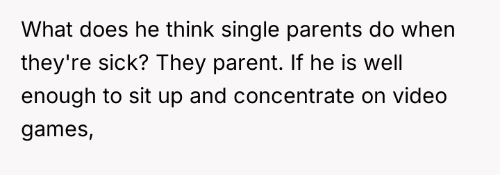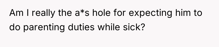 The original poster (OP) feels deeply frustrated because she believes her expectation for her sick husband to share in parenting duties is fair, based on her own behavior when she is ill. The central conflict lies between the OP's perceived standard of shared responsibility, even during sickness, and her husband's expectation of complete rest and exemption from childcare when he is unwell.