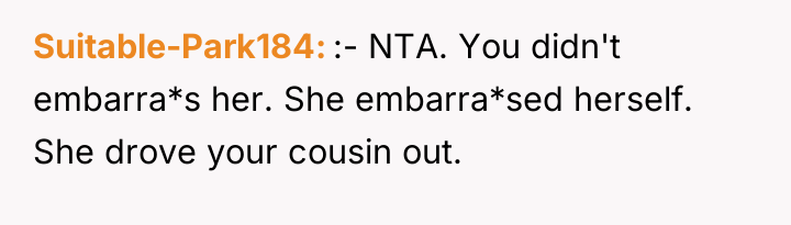 The sister-in-law's behavior escalated from inappropriate loudness to explicit racial stereotyping, which is a severe violation of social norms. When such a public and damaging statement is made, especially one that causes a guest to leave, the power dynamic shifts. The OP and their husband were defending the targeted cousin's wife and maintaining the safety of their home environment. The defense offered by the brother-in-law ("she was just drunk") is a common deflection tactic that attempts to excuse harmful behavior by attributing it to temporary impairment, thereby avoiding accountability for the content of the speech.