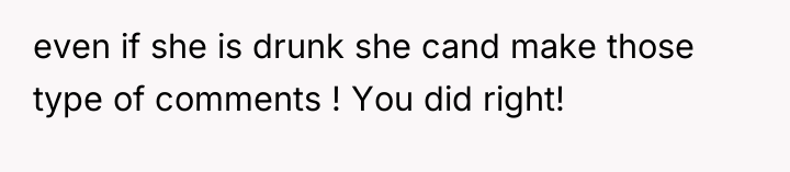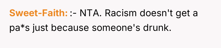 The original poster (OP) acted decisively to stop harmful, discriminatory behavior during a family event, leading to immediate conflict where their spouse supported them, but the offender and her husband reacted defensively. The central conflict lies between the OP's belief in setting immediate boundaries against racism and the in-law couple's expectation that the behavior should have been managed privately or excused due to intoxication.
