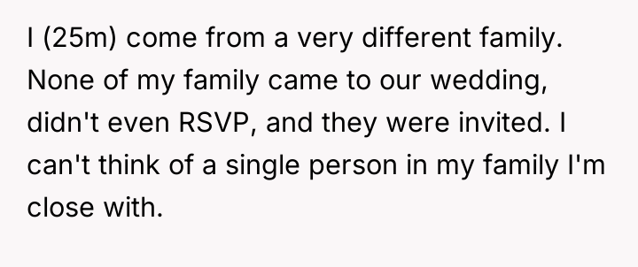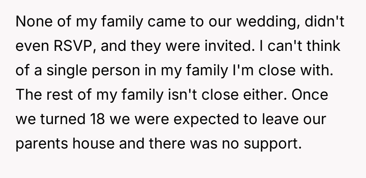 He carries the weight of a fractured family, where absence and silence replaced love and support. His wedding day was marked not by celebration from those closest to him, but by empty seats and unanswered invitations—a stark contrast to the warmth and unity he witnesses in his wife's world.