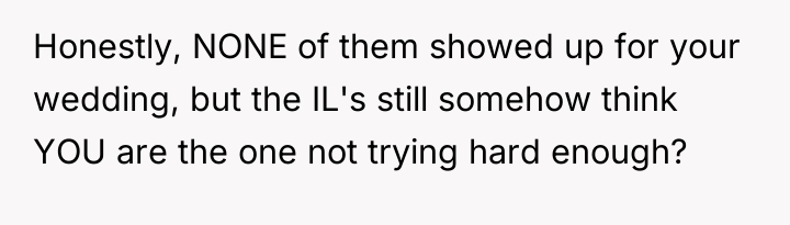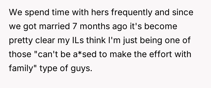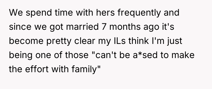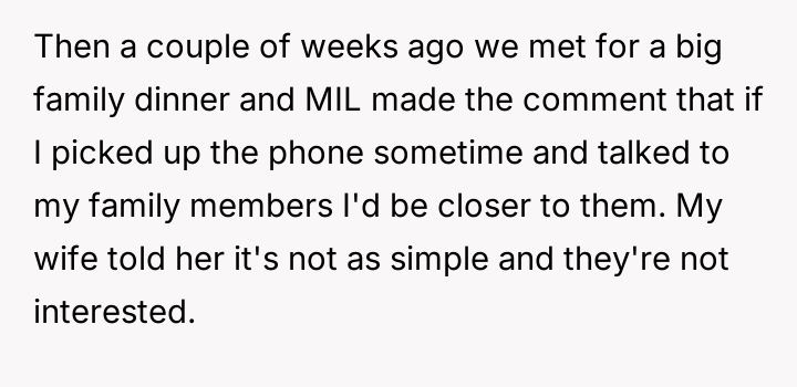 As renowned researcher Dr. Brené Brown explains, “Boundaries are the distance at which I can love you and me simultaneously.” In this scenario, the OP is navigating two vastly different sets of relational boundaries and expectations. The wife's family operates under a high-contact, high-involvement paradigm, where effort is equated with care, and a lack of contact is interpreted as a personal failing on the OP's part. The OP, conversely, comes from a zero-contact, high-independence paradigm where effort was actively discouraged or ignored by his parents.