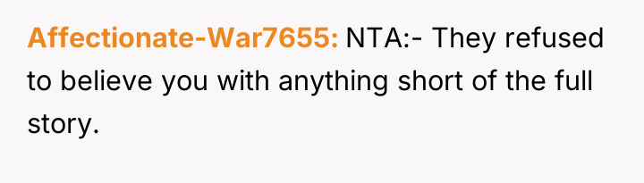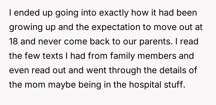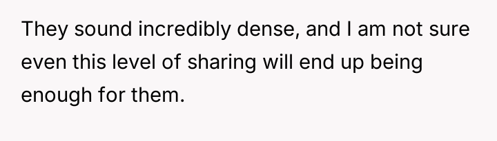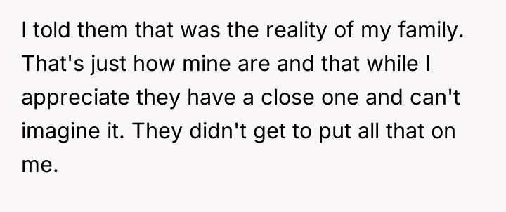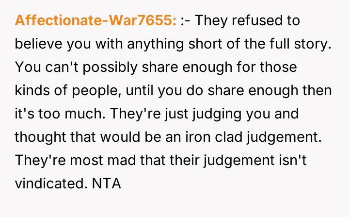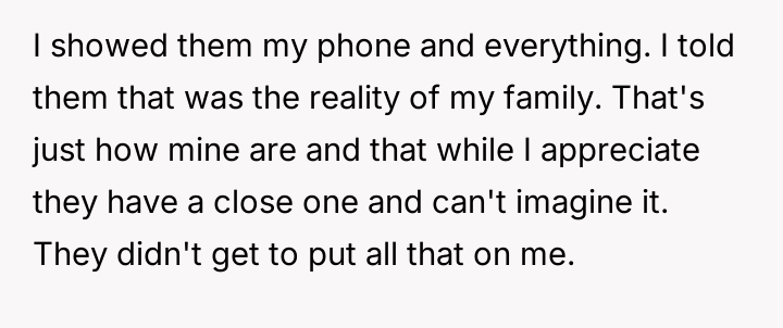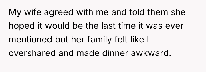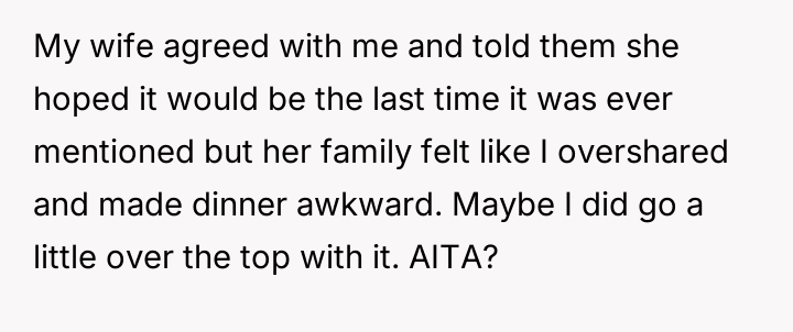 The OP's act of oversharing—presenting text messages and recounting the hospital incident—was a direct, albeit defensive, attempt to establish a boundary against the in-laws' judgment. He was trying to force them to accept his reality rather than judge it against their own. However, introducing such raw, painful data into a family dinner shifts the emotional climate, turning a social interaction into an intervention or an exposé. While his intent was self-defense, the execution likely felt overwhelming and invasive to the listeners, hence the feeling that he 'overshared' and made dinner awkward.