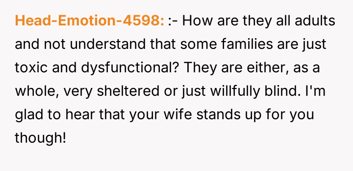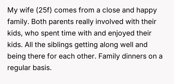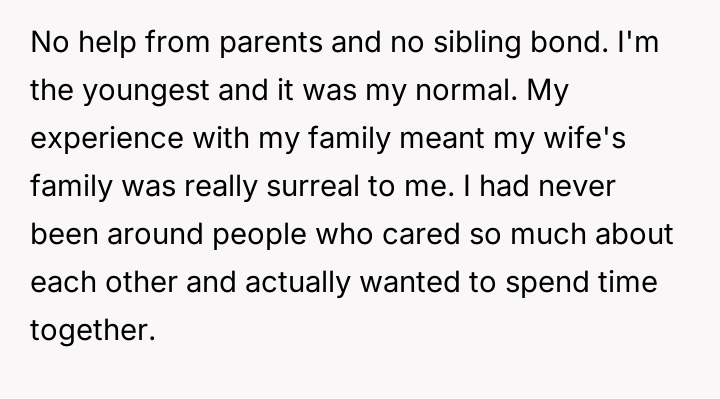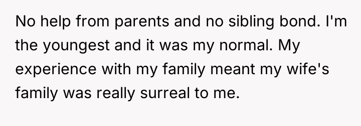 The original poster (OP) is caught between the deeply ingrained family norms of their wife's highly involved, supportive family and the reality of their own distant, emotionally unavailable family structure. The central conflict arises when the wife's parents judge the OP's lack of contact with his family, failing to accept the severe emotional neglect and distance he experienced growing up, despite the OP providing detailed evidence of this reality.