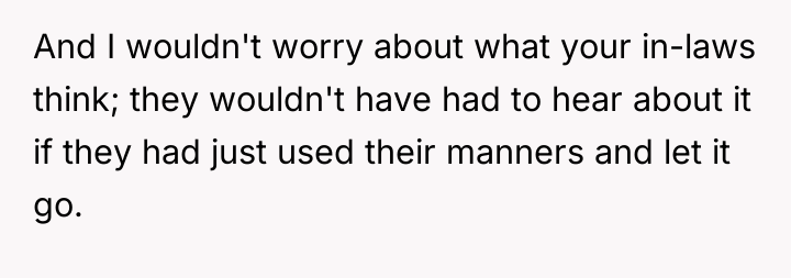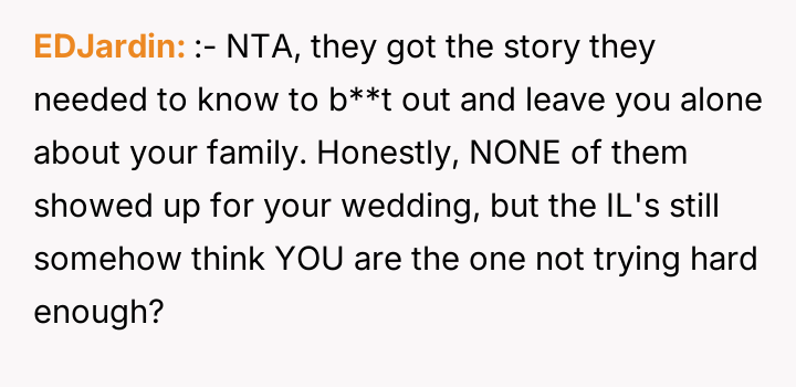 The OP's actions were understandable as a defense mechanism against unfair criticism, but perhaps tactically ineffective. A more constructive approach might involve reiterating that his relationship is distant, not broken by choice, and then redirecting the conversation, rather than escalating with evidence. The recommendation is for the OP and his wife to present a unified, calm front to the in-laws, clearly stating the established reality of his family's boundaries, and firmly stating that further discussion or critique of his efforts is unwarranted.