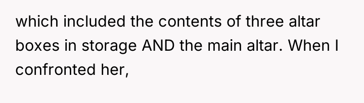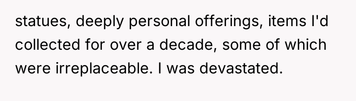 The original poster experienced a significant violation of personal property and spiritual space when her sister-in-law destroyed valuable and sentimental altar items. Her attempt to seek financial restitution led to the sister-in-law leaving immediately and escalating the conflict to her family, painting the OP as unreasonable and punitive.