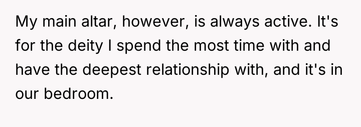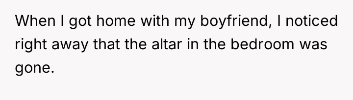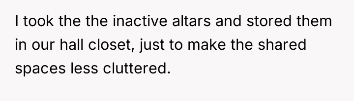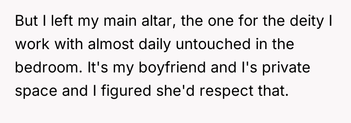 As renowned researcher Dr. Brené Brown explains, “Boundaries are the distance at which I can love you and me simultaneously.” In this situation, the OP established a clear boundary by keeping her main altar in her private bedroom, assuming a temporary guest would respect this personal space. The sister-in-law (Kayla) violated this boundary under the guise of 'helping,' which often masks controlling behavior or a fundamental lack of respect for another person's deeply held beliefs.