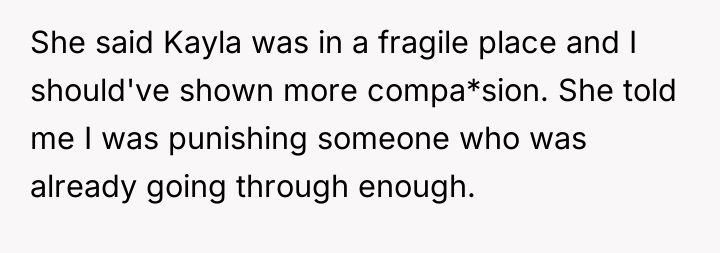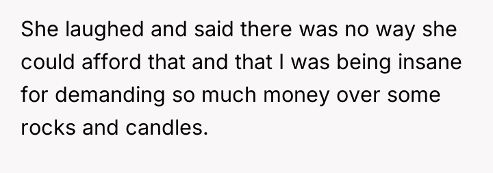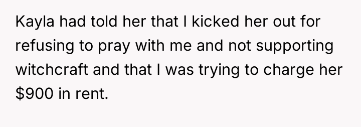 Kayla's actions stem from a combination of ignorance regarding the OP's faith and a sense of entitlement to control the shared living environment, evidenced by her judgmental comments about witchcraft. Demanding $900, while perhaps difficult for Kayla to pay, was a direct attempt by the OP to quantify the tangible loss and assert accountability for a destructive action. Kayla's subsequent escalation—falsely framing the situation to her mother—indicates an avoidance of responsibility. The boyfriend's neutrality exacerbates the situation by failing to validate the OP’s legitimate grievance against his family member.