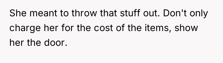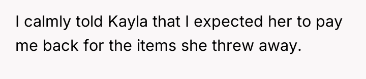 The OP was justified in demanding restitution for the destroyed property, as the items were neither hers to touch nor dispose of. However, a more effective initial approach might have been to first establish clear, non-negotiable consequences for the violation of boundaries and property, separate from a direct monetary demand, perhaps insisting on a formal apology and a structured repayment plan, while firmly countering the false narrative spread by Kayla and her mother.