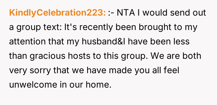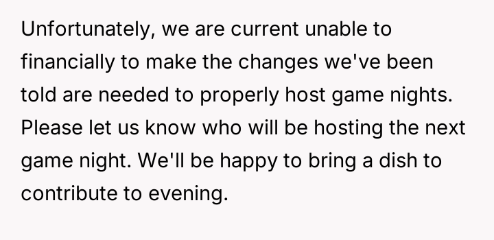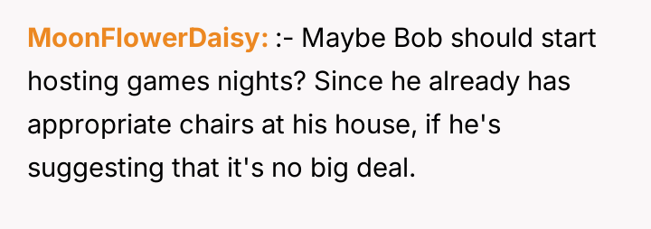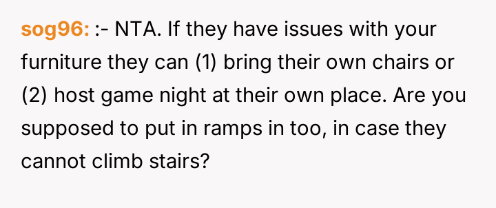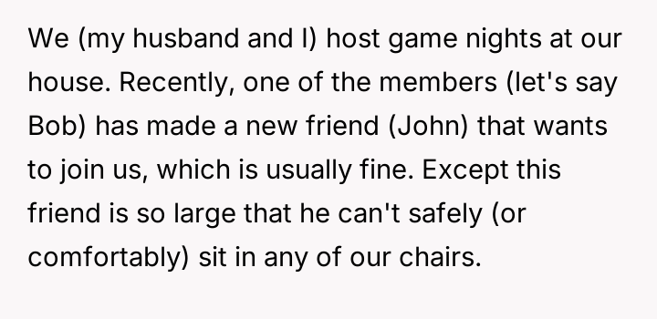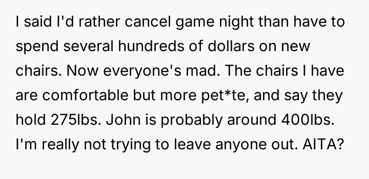 The OP's action of prioritizing their financial boundary over maintaining game night temporarily was an assertion of self-respect against unreasonable demands. A constructive recommendation for the future would be for the OP and husband to clearly communicate a policy: If a guest requires seating beyond standard capacity (e.g., above 300 lbs), they must notify the host in advance so that arrangements (like renting a specific chair or the guest bringing their own heavy-duty option) can be made collaboratively, rather than unilaterally demanding the host purchase permanent fixtures.