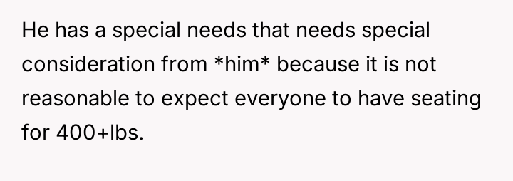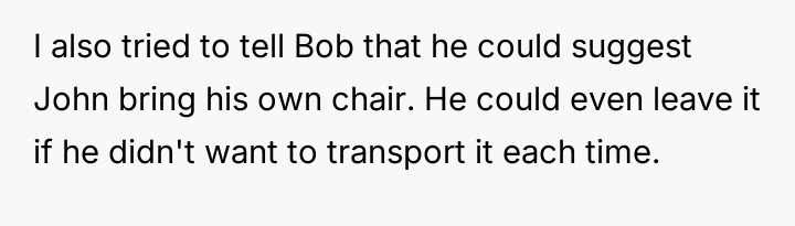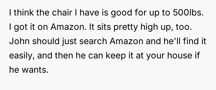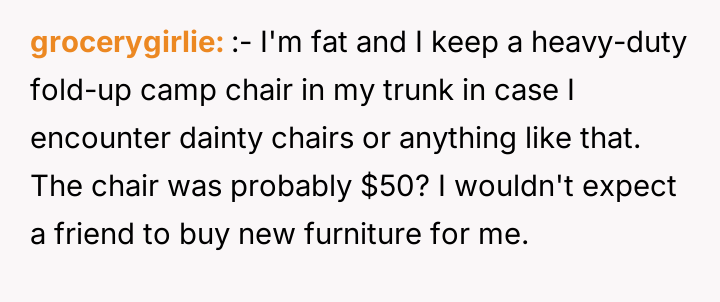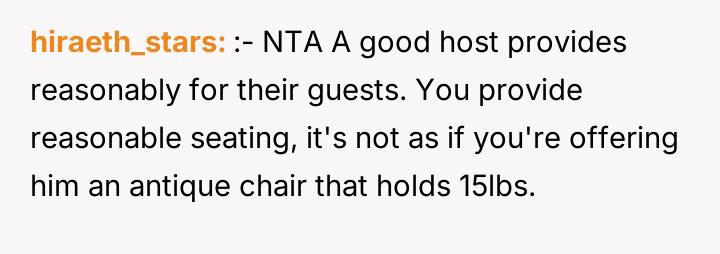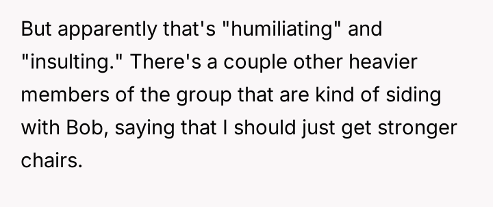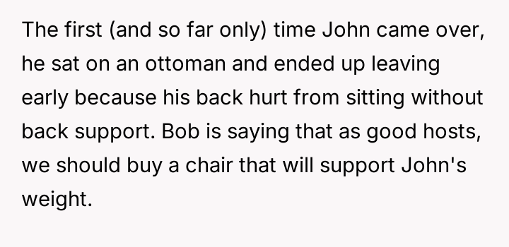 The core issue here revolves around the concept of 'reasonable accommodation' versus 'undue burden.' While hospitality encourages making guests comfortable, this usually pertains to standard offerings. Demanding the host purchase furniture capable of supporting 400 lbs, while the current chairs meet a standard capacity (275 lbs), crosses into an undue burden, especially when the guest (or the friend bringing him) has alternatives, like bringing specialized seating. Bob’s framing of bringing one's own chair as 'humiliating' shifts the emotional labor and the expense onto the host under the guise of sensitivity, which is an unhealthy dynamic.