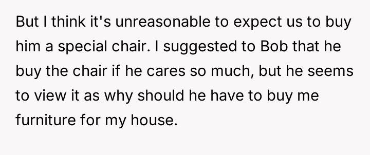 Is it an unreasonable expectation for hosts to purchase expensive, specialized furniture to accommodate a guest's specific physical needs when other solutions, such as the guest providing their own seating, are available? Or, does the responsibility of being a truly inclusive host outweigh the financial burden of upgrading essential household items?