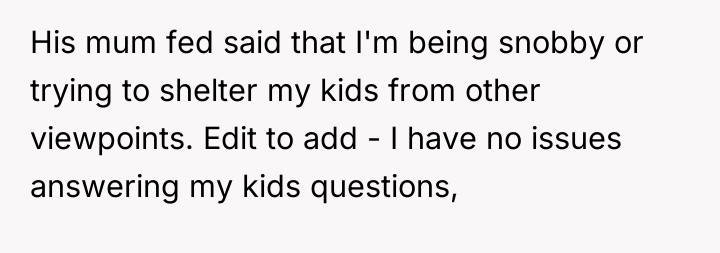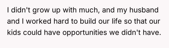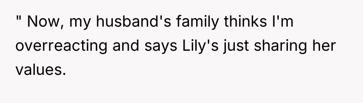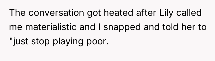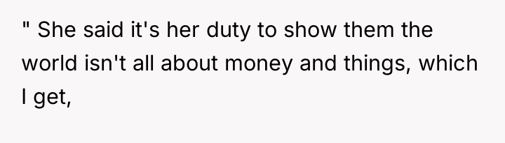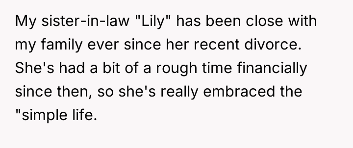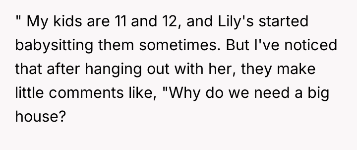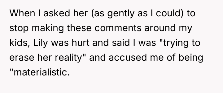 Lily’s motivation appears rooted in her recent hardship, leading her to embrace minimalism as a coping mechanism or philosophical stance, which she feels ethically bound to impart to the children. However, when hosting or babysitting, her role shifts from a family member sharing personal philosophy to a temporary caregiver in another household. By actively framing the OP's lifestyle negatively (e.g., implying materialism), she steps over the implicit boundary of respecting the host family's values. The OP’s reaction, while escalating the situation with the harsh comment, stems from a protective instinct to validate their family’s stability and hard work against an external critique.