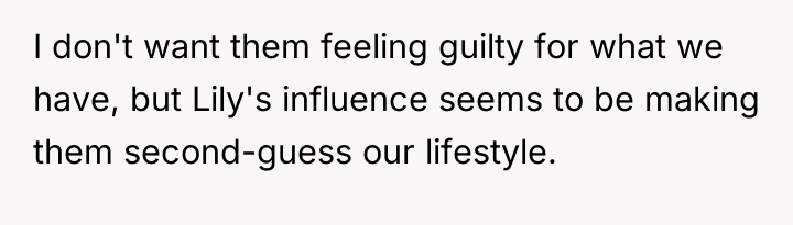 The OP's initial request to moderate comments was appropriate for protecting their parenting goals. The professional recommendation is that the OP needed to focus on the *impact* on the children rather than judging Lily’s lifestyle (i.e., avoiding the 'playing poor' comment). Future discussions should center on mutual respect for differing financial realities and parental authority. The OP can teach their children gratitude for what they have while also acknowledging that other valid life paths exist, without allowing those paths to generate guilt about their own comfort.