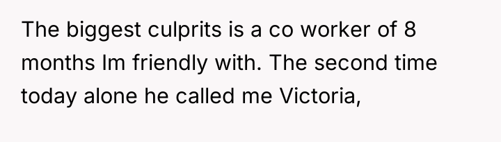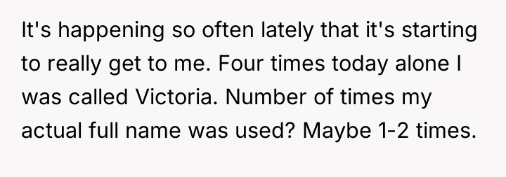 She carries a name that is uniquely hers, a quiet emblem of her identity that rarely graces the ears of those around her. Yet, day after day, she is overshadowed by a name not her own—Victoria—a misnomer that clings to her like a shadow, eroding the edges of who she truly is. The constant misnaming, especially from those she trusts and works alongside, chips away at her spirit, turning small slips into deep wounds of invisibility.