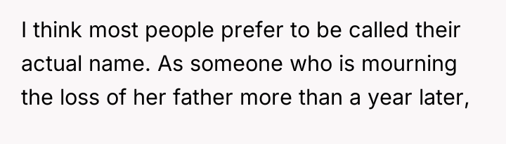As renowned relationship expert Dr. John Gottman explains, “Communication isn't just about what you say, it's about how you say it and how the other person receives it.” This situation highlights a conflict between the need for personal validation (having one's name respected) and situational empathy (understanding a coworker's heightened emotional state due to recent bereavement).