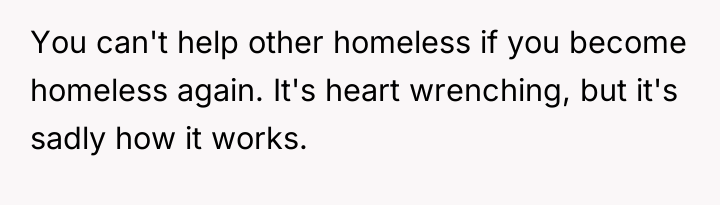 The original poster is navigating a critical juncture: moving from homelessness to housing stability. This new security is fragile, and the fear of landlord repercussions or negative neighbor interactions is a valid concern rooted in maintaining their primary need—shelter. Allowing an unvetted individual into a new rental unit introduces significant risk concerning lease agreements, which often prohibit unauthorized guests, especially those who are homeless. The request itself—for warmth and charging—is immediate and basic, appealing strongly to empathy, which the poster clearly felt. However, empathy must be tempered by practical realities when one's own foundation is newly established.