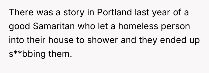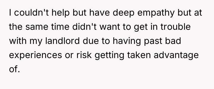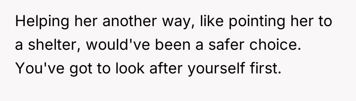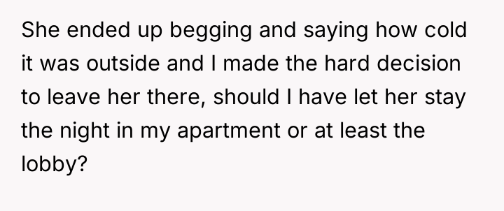 The original poster experienced a conflict between deep empathy for a vulnerable person and the need to protect their new, hard-won housing stability. The decision to deny entry, while driven by fear of landlord issues and past negative experiences, resulted in leaving someone in immediate, harsh weather conditions.