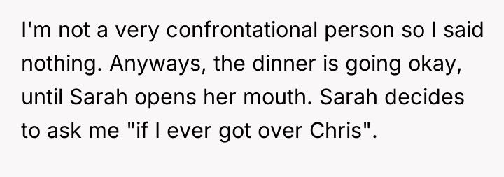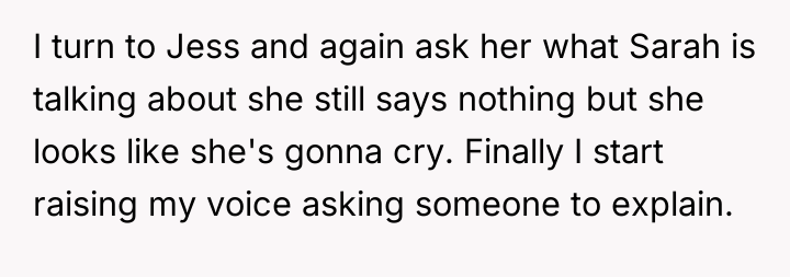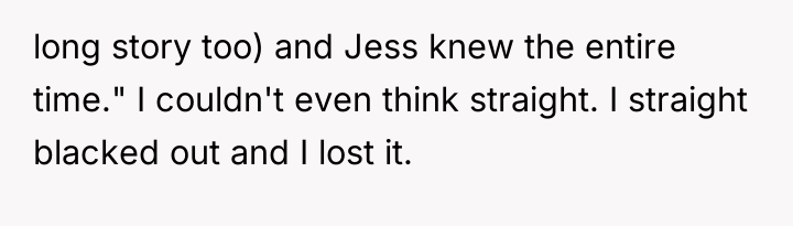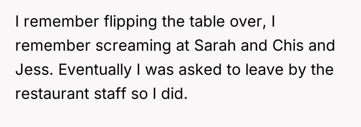 The OP's reaction—flipping a table and screaming—is indicative of an acute trauma response, often referred to as 'flooding,' where the nervous system is overwhelmed by a threat that confirms past abuse narratives. The discovery that her rape was orchestrated, and that her close friend Jess possessed this horrifying knowledge without intervening or warning her, represents a double betrayal: a violation of physical safety followed by a profound violation of trust and emotional safety. Jess's silence and Sarah's provocative questioning served as direct triggers, pushing the OP past her capacity for controlled response. The focus on Sarah's pregnancy by others ignores the severity of the newly revealed information; accountability for severe harm, especially premeditated sexual assault, does not simply expire because time has passed or because others have moved into new life stages.