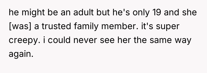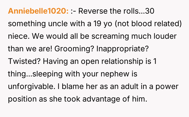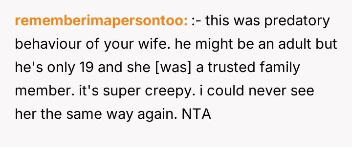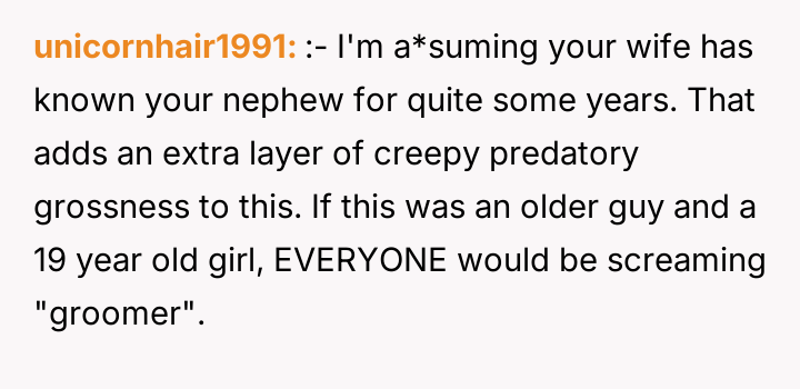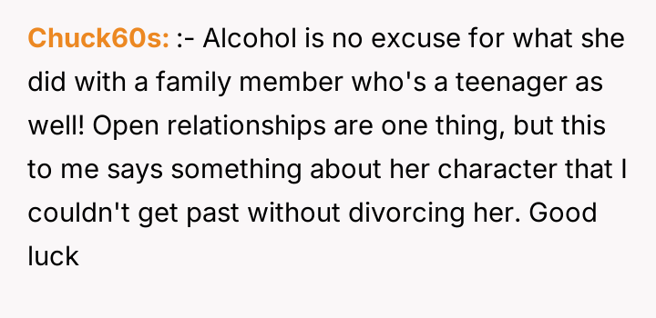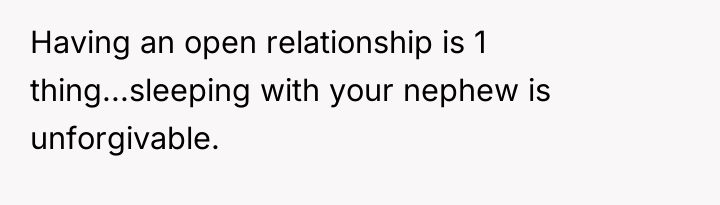 This situation presents a complex entanglement of marital boundaries, kinship ethics, and situational context. The OP's primary conflict stems from the boundary violation crossing into the realm of immediate family trust, an area often considered non-negotiable even within non-monogamous structures. The wife's defense centers on mitigating factors (alcohol, lapse in judgment) and existing agreements (open marriage), yet these agreements typically presuppose external partners, not an intimate relative of the spouse. The dynamic is further complicated by the nephew's youth (19) and dependent status, suggesting a potential power imbalance, regardless of the wife’s intentions.