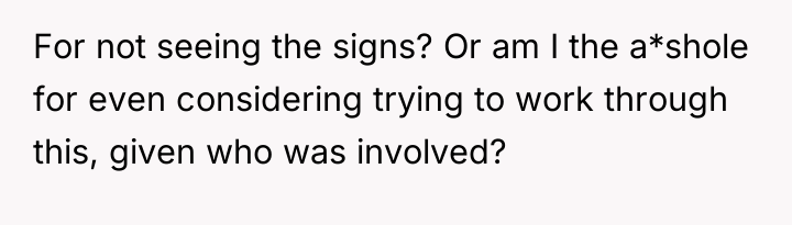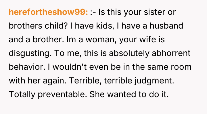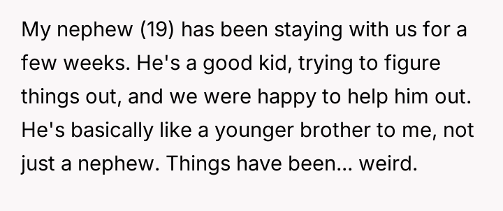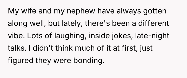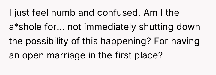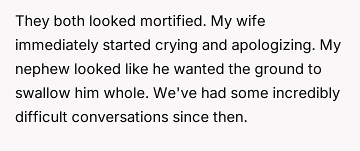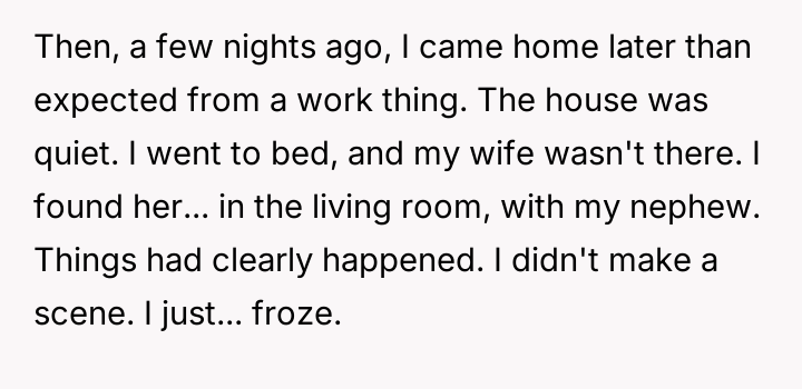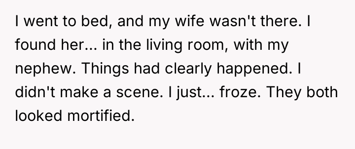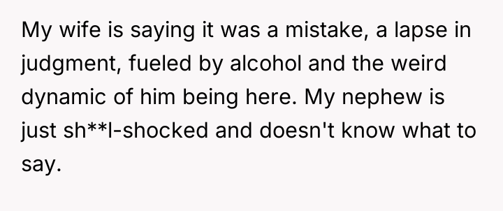 The OP's self-doubt regarding his role in creating the environment is understandable but misplaced; while open marriages require rigorous boundary setting, they do not excuse deliberate infidelity, especially with a family member. The OP's actions in this immediate aftermath—freezing rather than reacting—suggest shock rather than complicity. Professionally, the OP's immediate focus should be on establishing safety and distance for the nephew to leave, allowing space for the marriage to be assessed once the immediate crisis has passed. Any path forward requires explicit, non-negotiable boundary definitions regarding extended family that supersede the 'open' aspect of the marriage.